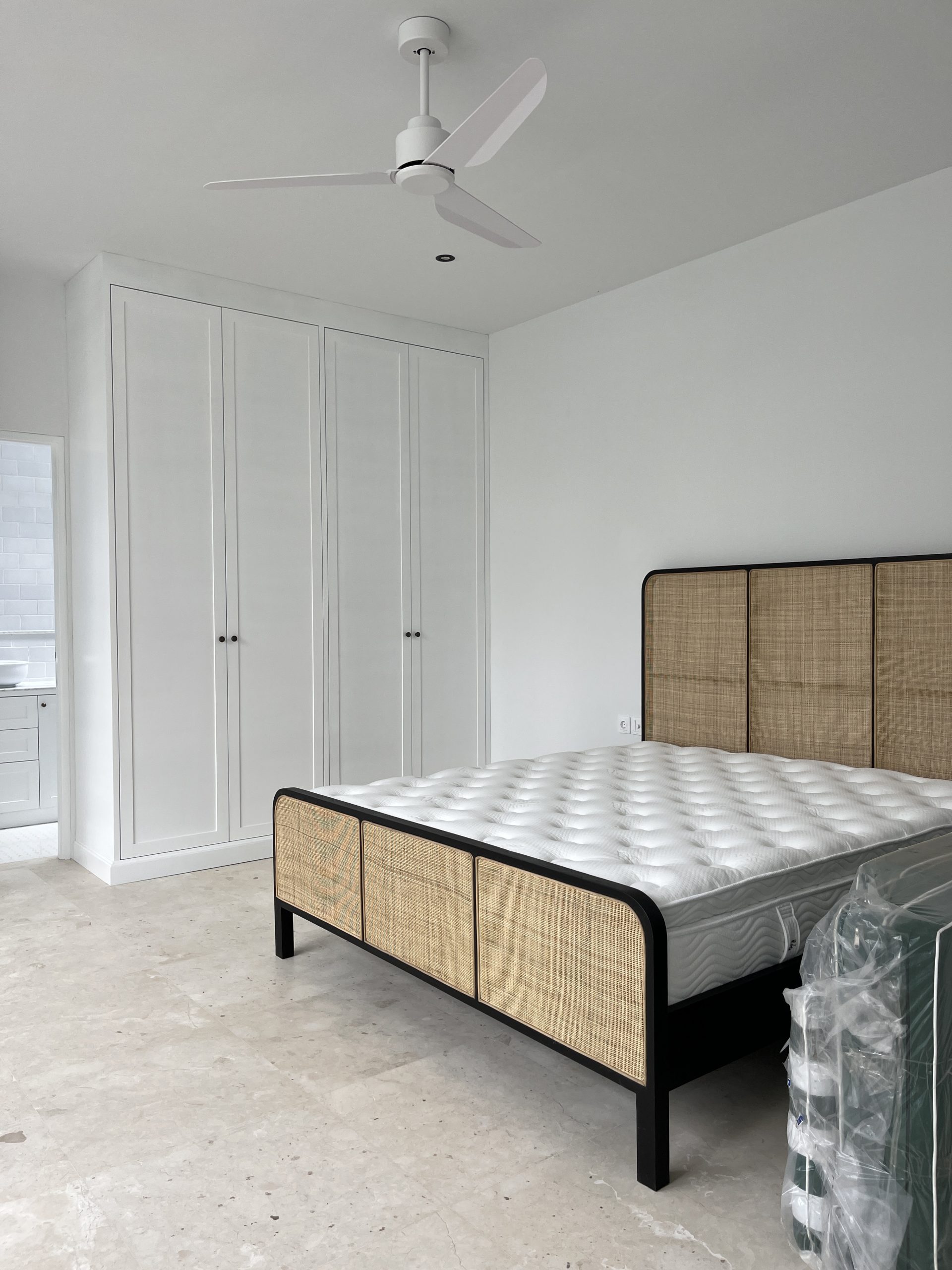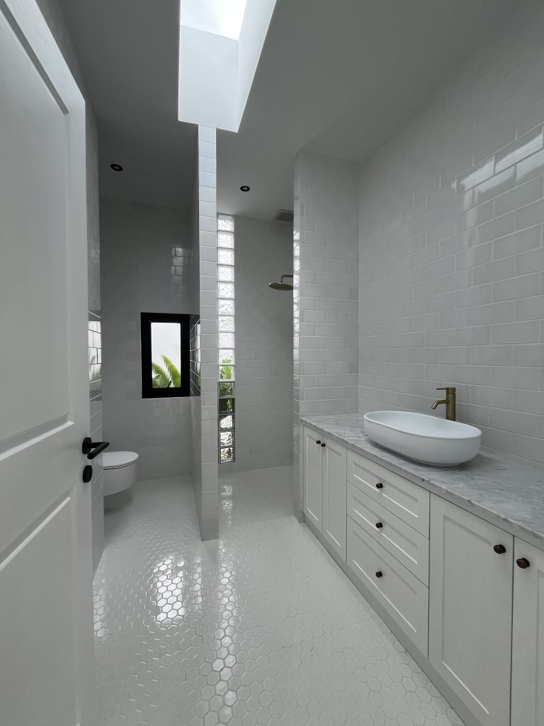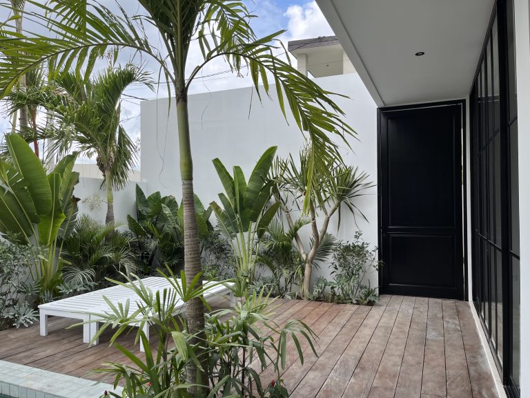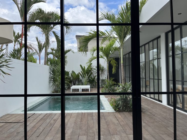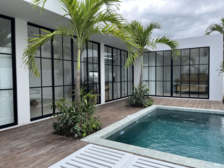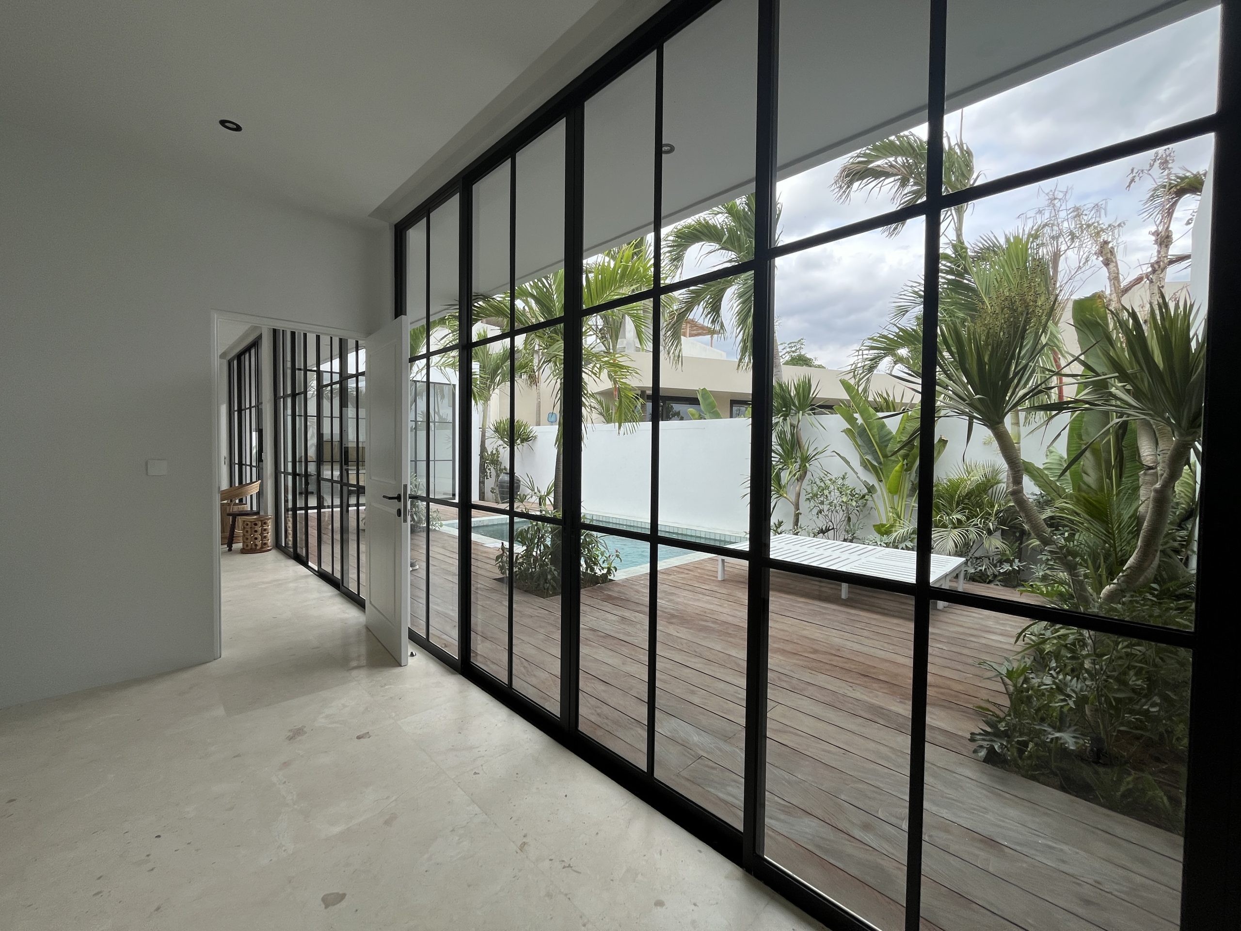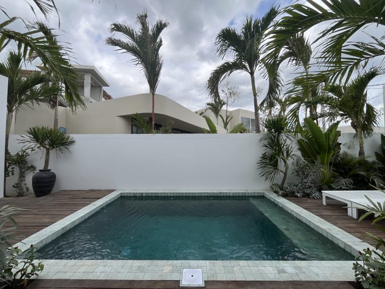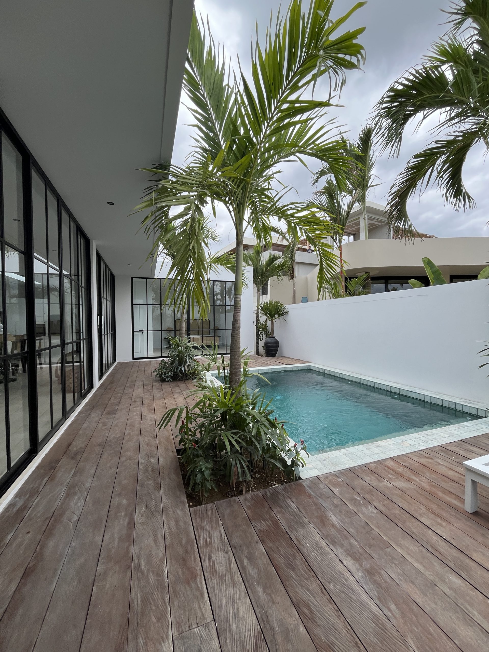 This modern tropical villa features marble flooring, a rustic ulin wood pool deck, and duco-finished doors that highlight its clean, minimalist design. The green stone pool serves as a refreshing focal point, blending natural elegance with contemporary comfort. Built with precision and detail, the space captures the essence of refined tropical living.