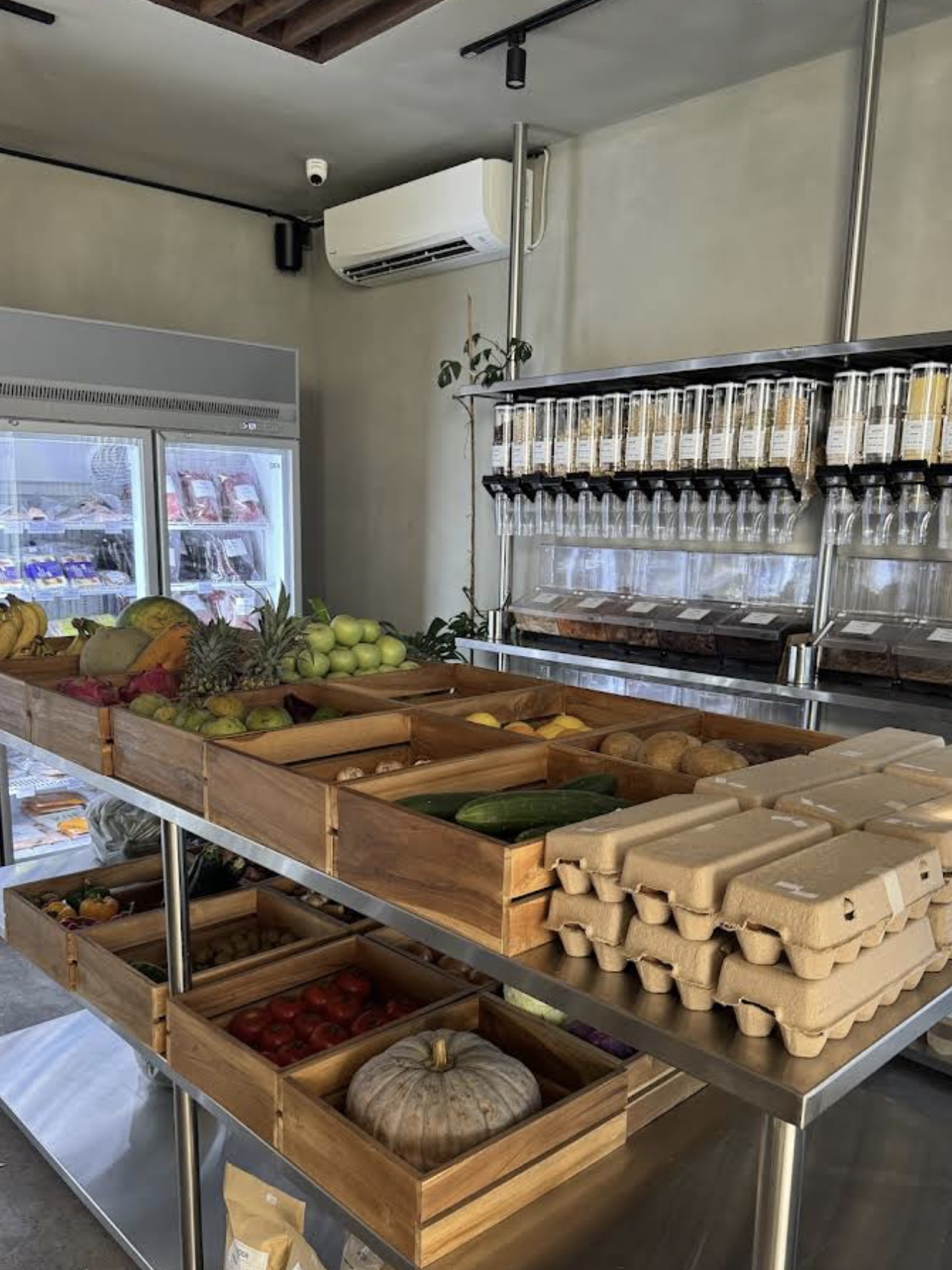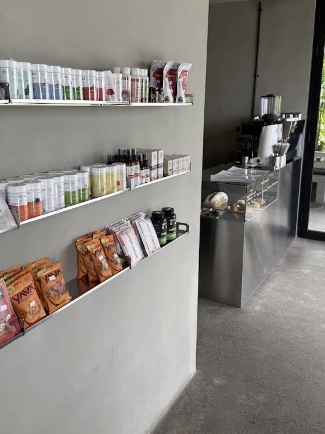 Mode Market presents a clean industrial aesthetic with a refined minimalist approach. The walls are finished with smooth cement spray (acian spray) for a raw yet elegant texture, complemented by polished concrete flooring that enhances the natural tone of the space. The overall design highlights functionality and simplicity, creating a modern retail environment that feels both contemporary and inviting.